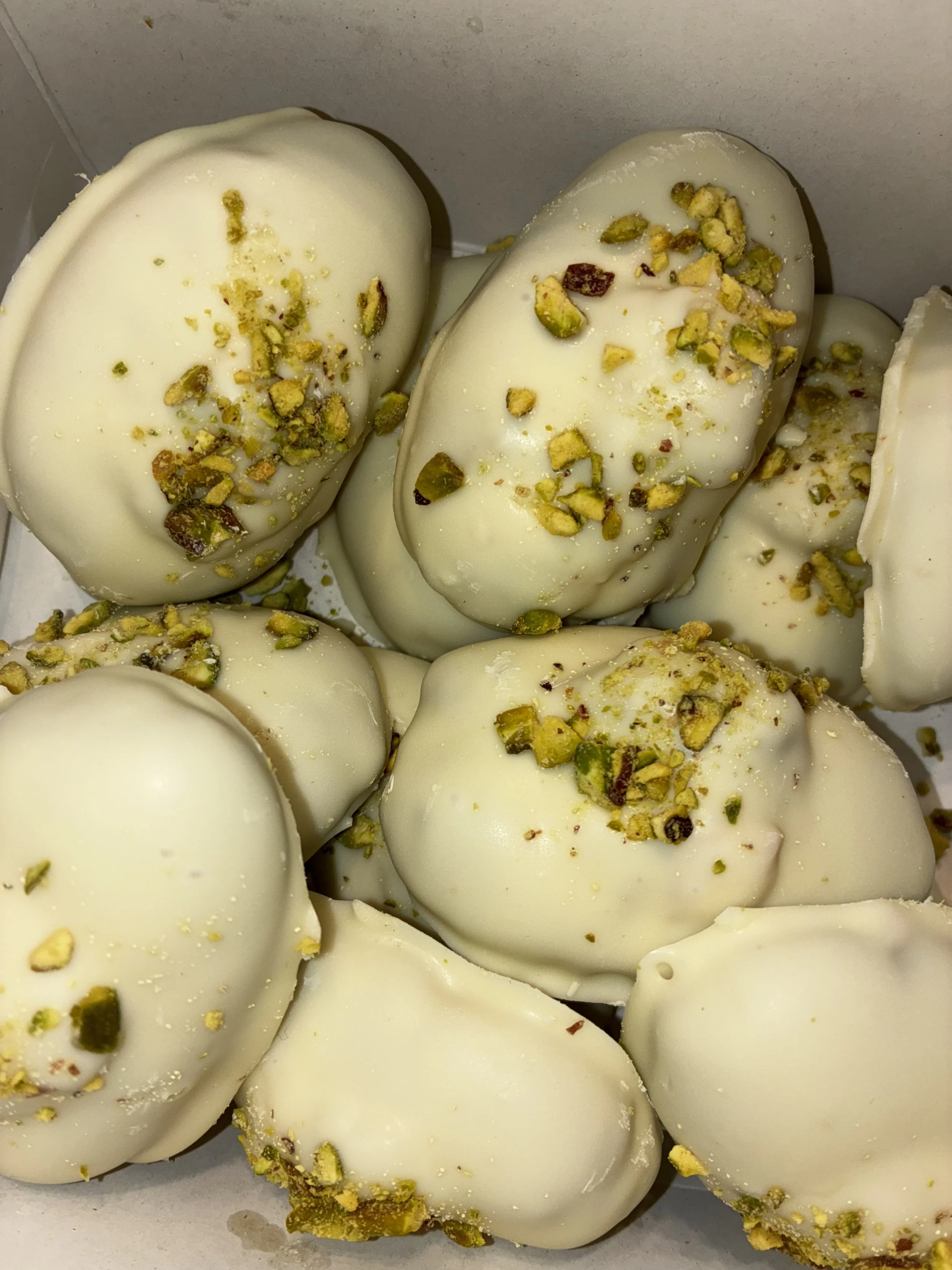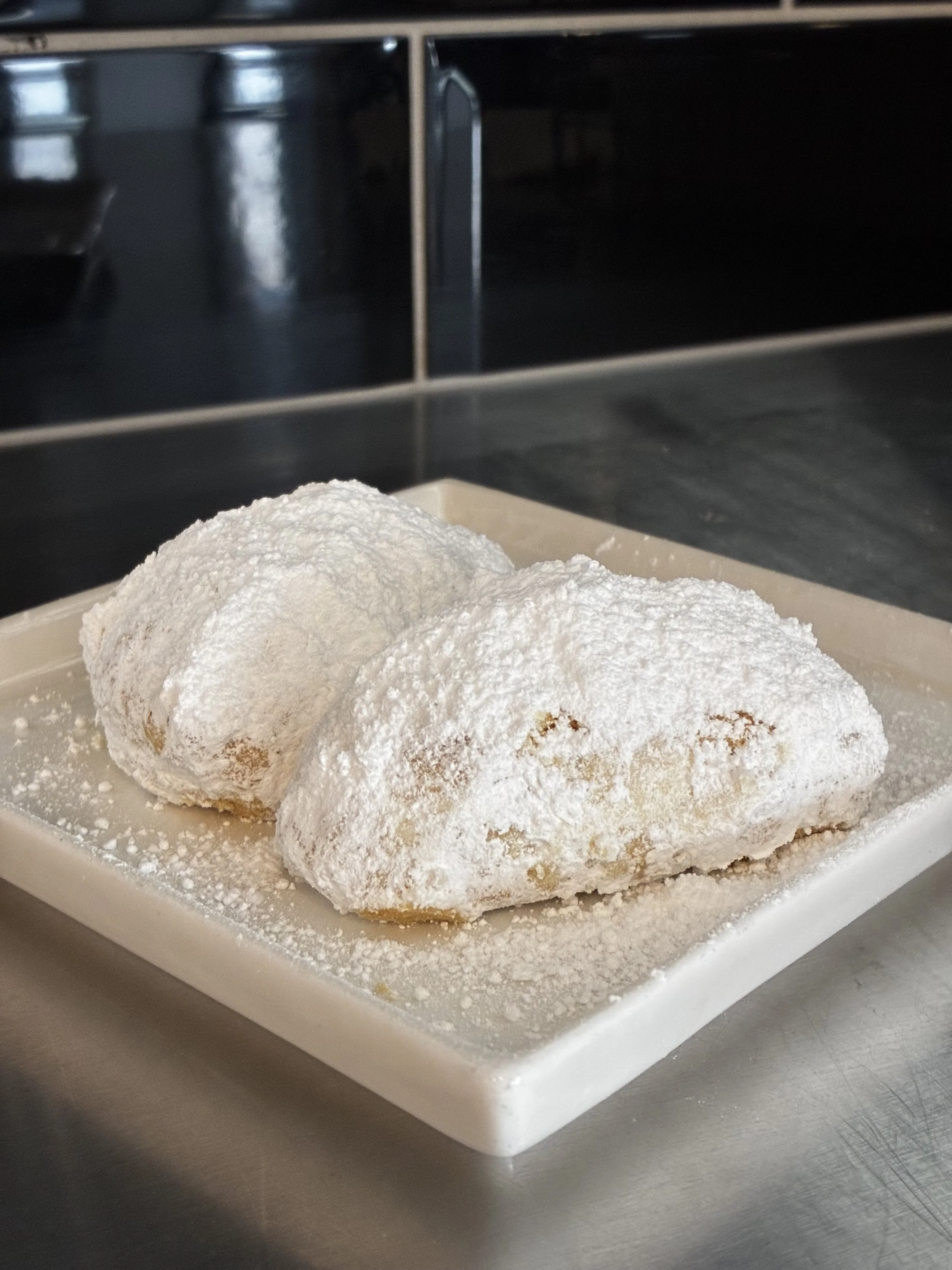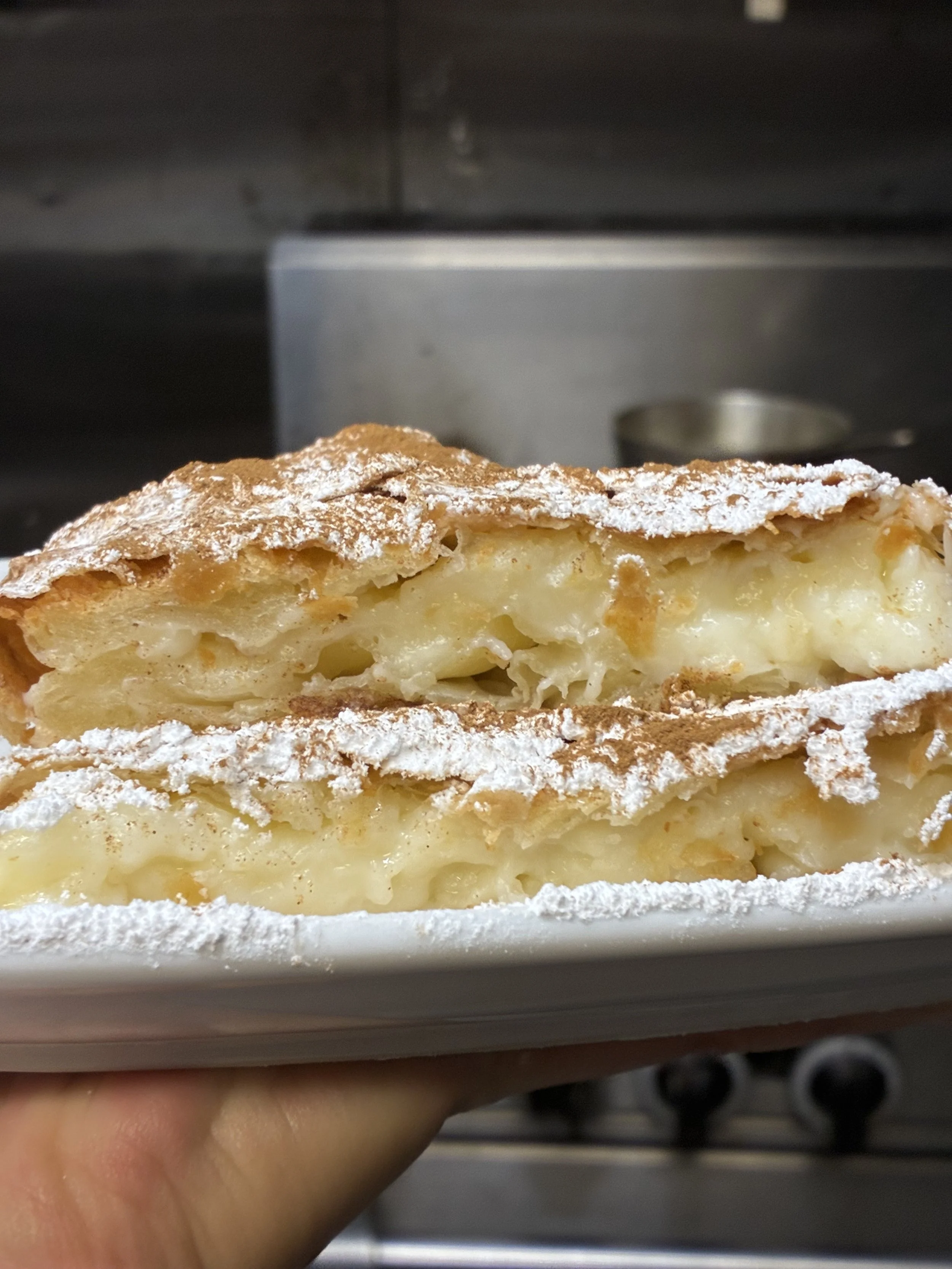 Hand made golden filo pastry, dusted with icing sugar and filled with creamy custard. Best served warm.